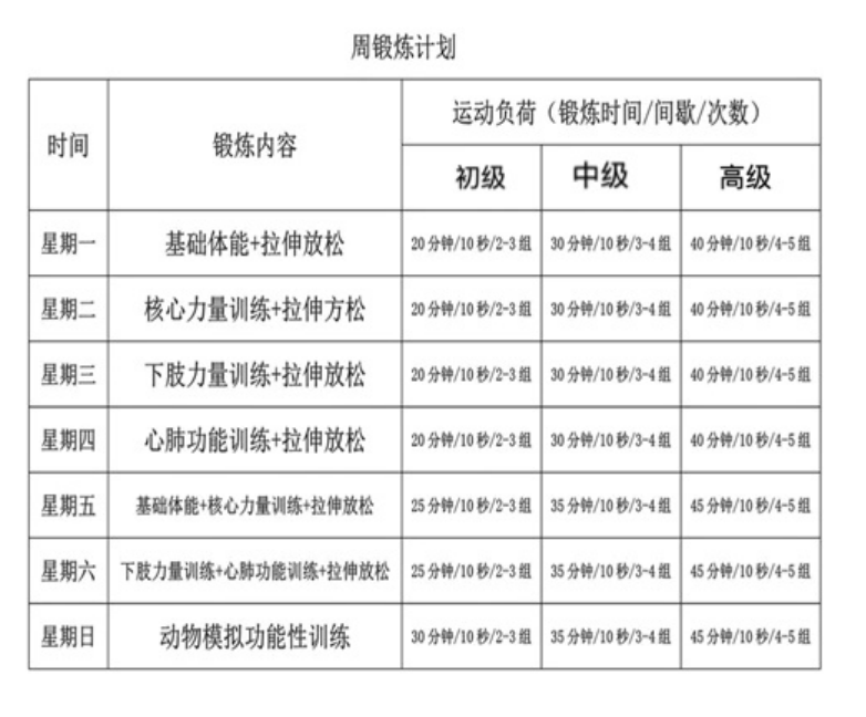 居家期间以“体能天天练”为主题,希望学生每天进行体育锻炼,从而增强体质健康。居家锻炼内容主要分为 “基础体能训练”“体质测试项目针对性提升”“心肺功能提升”“拉伸放松”等模块为主要内容,便于学生在家进行体育锻炼。同时,要求学生根据时间安排每天不能低15分钟二十四式简化太极拳练习。建议在进行身体素质训练前先进行太极拳练习,既可以练习太极拳达到健身健心目标,又可以充分调动身体积极性,达到准备活动目的。我们以一个星期为周期制定锻炼计划,并根据学生身体素质差异制定了不同等级运动负荷的锻炼方式,使学生锻炼更科学,体质更健康。